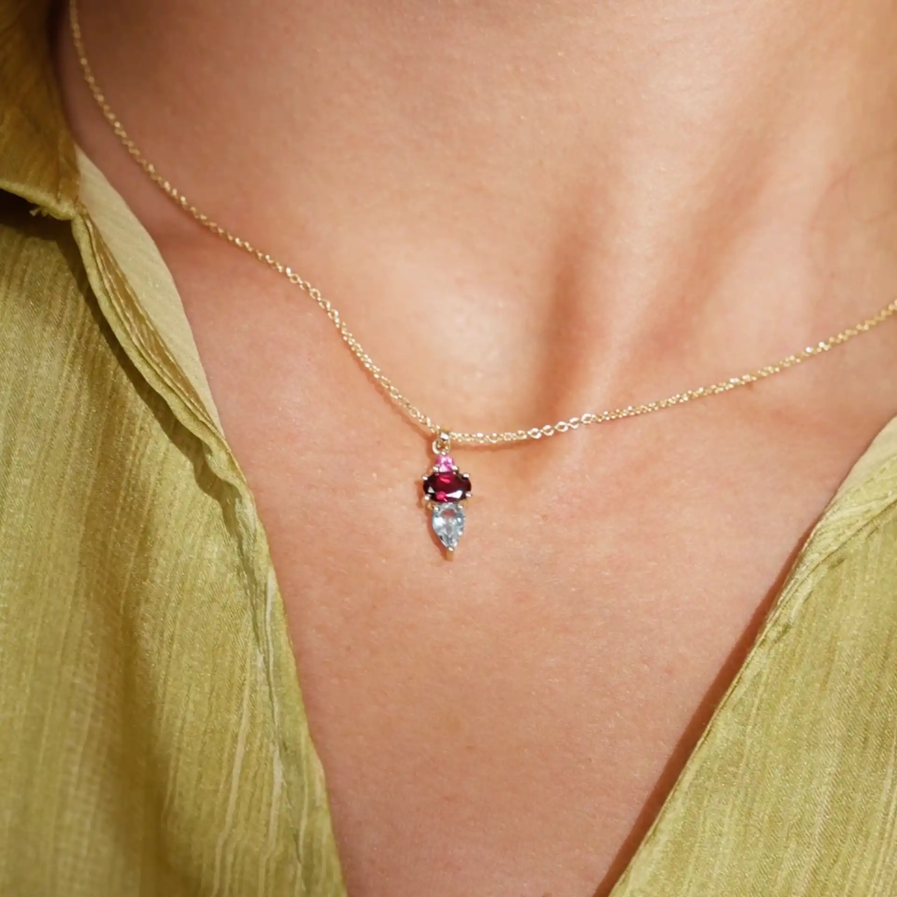 Normalpris 1.995,00 krElegant halskæde i 8 kt. guld med rhodolit, pink og blå topas sten.