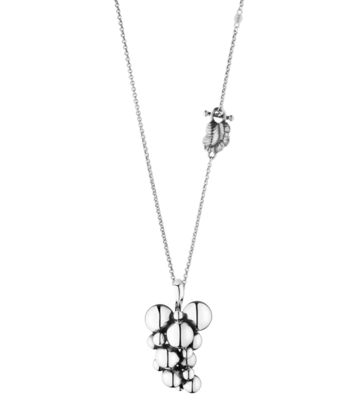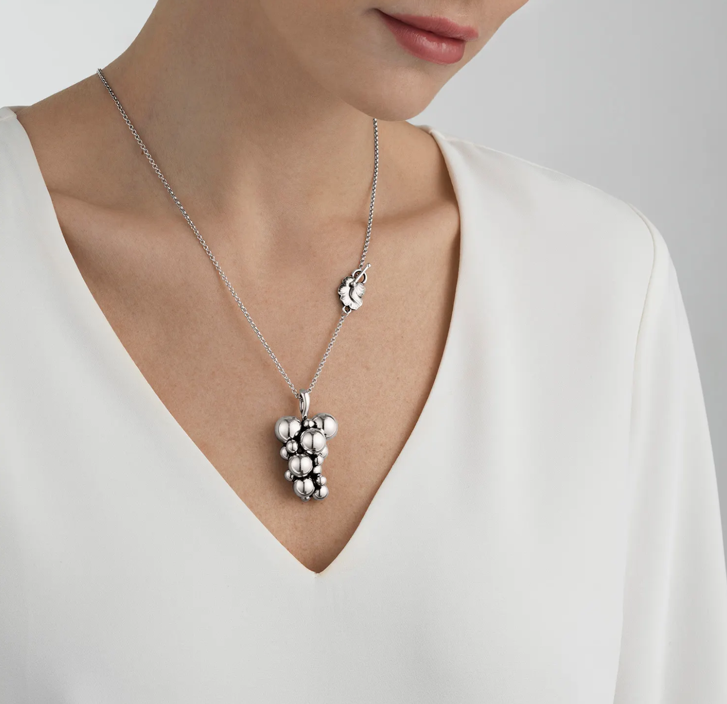 Sølv Moonlight Grapes halskæde, den store model på 45mm og 60cm kæde som har en elegant og sikker “blad”-lås. MOONLIGHT GRAPES-kollektionen har sin oprindelse i Georg Jensen-design i starten af 1900-tallet. Kollektionen giver det ikoniske vindruemotiv et nyt og moderne twist. Smykkerne er skulpturelle og feminine. Ægte historisk og helt nutidig.