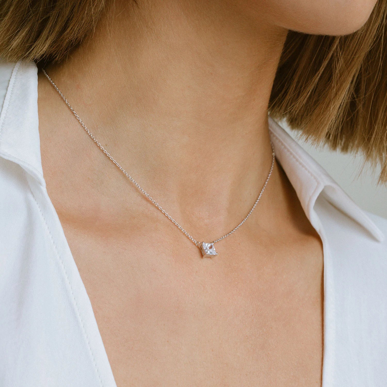 Normalpris 749,00 krEllera Quadrato halskæde med håndfattede syntetiske zirkonia. Halskæden er lavet i sterling sølv, Kæden måler 45cm.